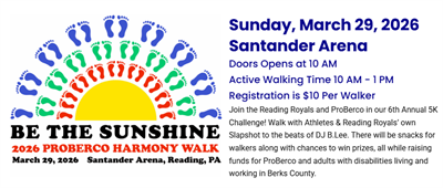 Join the Reading Royals and ProBerco in our 6th Annual 5K Challenge! Walk with Athletes & Reading Royals’ own Slapshot to the beats of DJ B.Lee. There will be snacks for walkers along with chances to win prizes, all while raising funds for ProBerco and adults with disabilities living and working in Berks County.