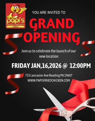 It’s time to celebrate! 🎉 You’re invited to join us for the Grand Opening of Pap’s Fried Chicken 🍗! Come help us mark this exciting milestone with a ribbon cutting ceremony at 2:00 PM.